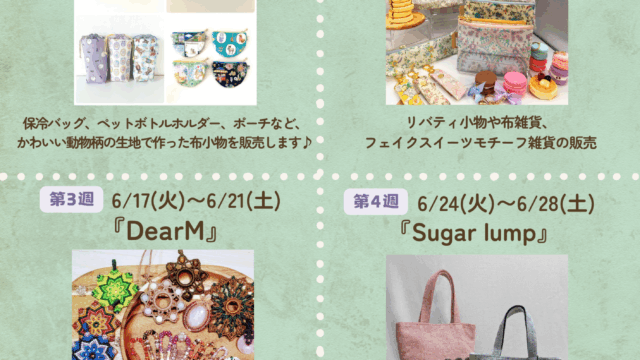 お知らせ 「クラアパ9月の作家さんのPOPUP」 入口のテーブルで週替わりに開催です ★9/ 2(火)~6(土) さゆき堂 布小物 ★9/ 9(火)~13(土) eleven 布小物 婦人服 ★9/16(火)~20(土) Luluke ストラップ他★9/24(水)~27(土) ブルーメン 変色レジン他 2025年8月20日 turutome craft apartment日暮里 …