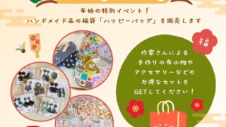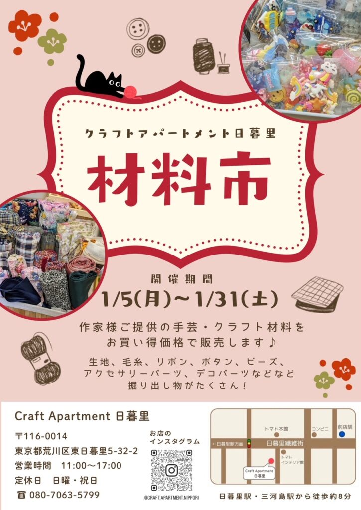 「毎年好評な材料市のご案内」 作家様ご提供の生地、アクセサリーパーツ 毛糸等をお買い得価格で販売いたします 1/5(月)~1/31(土)
