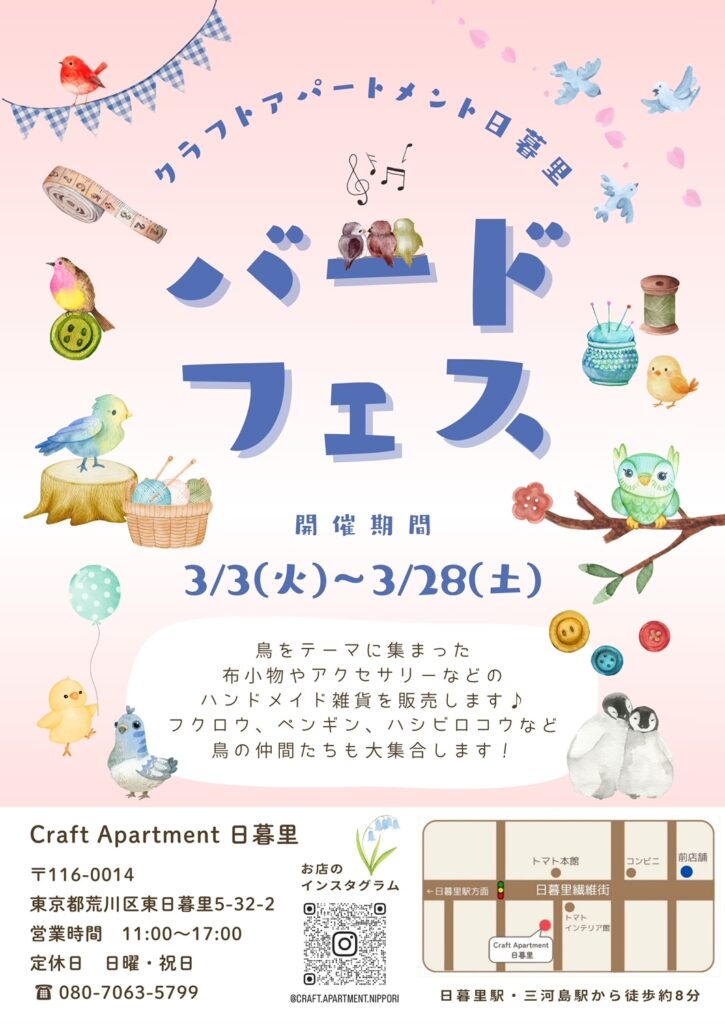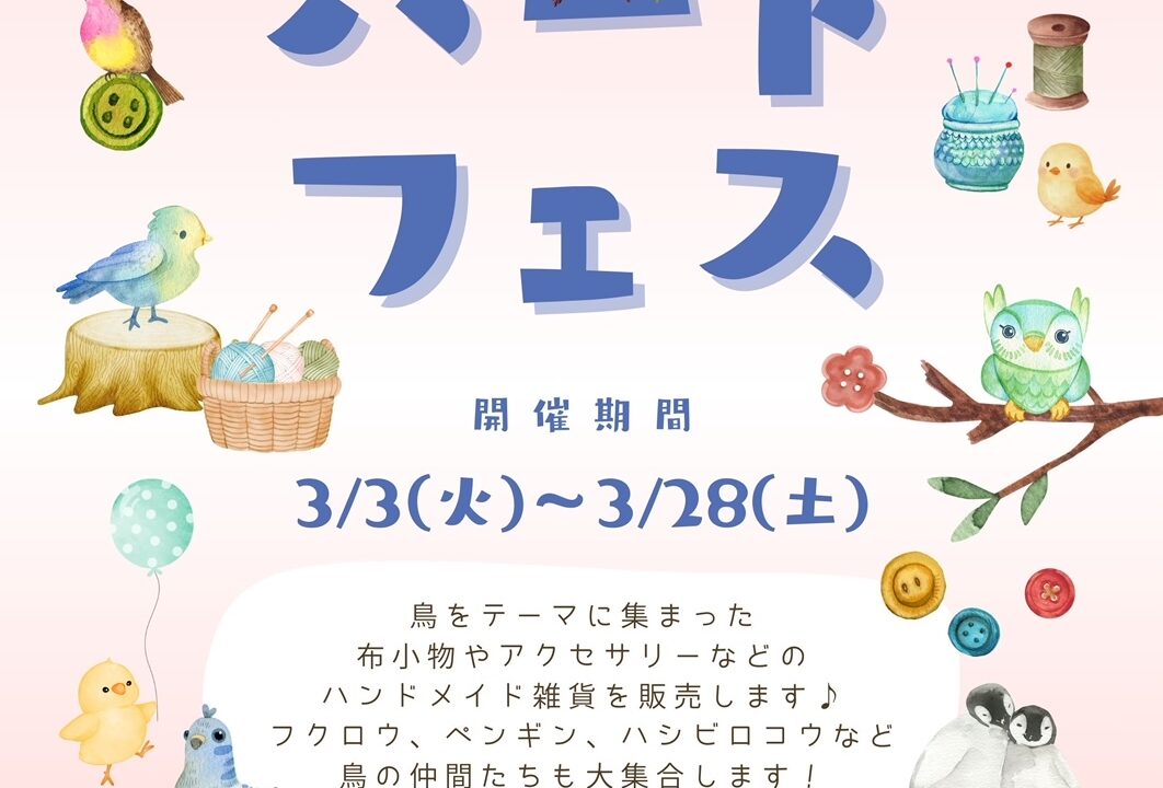 『バードフェス』のご案内 奥のテーブルでバードをテーマにした ハンドメイド品を販売します 3/3(火)~3/28(土)