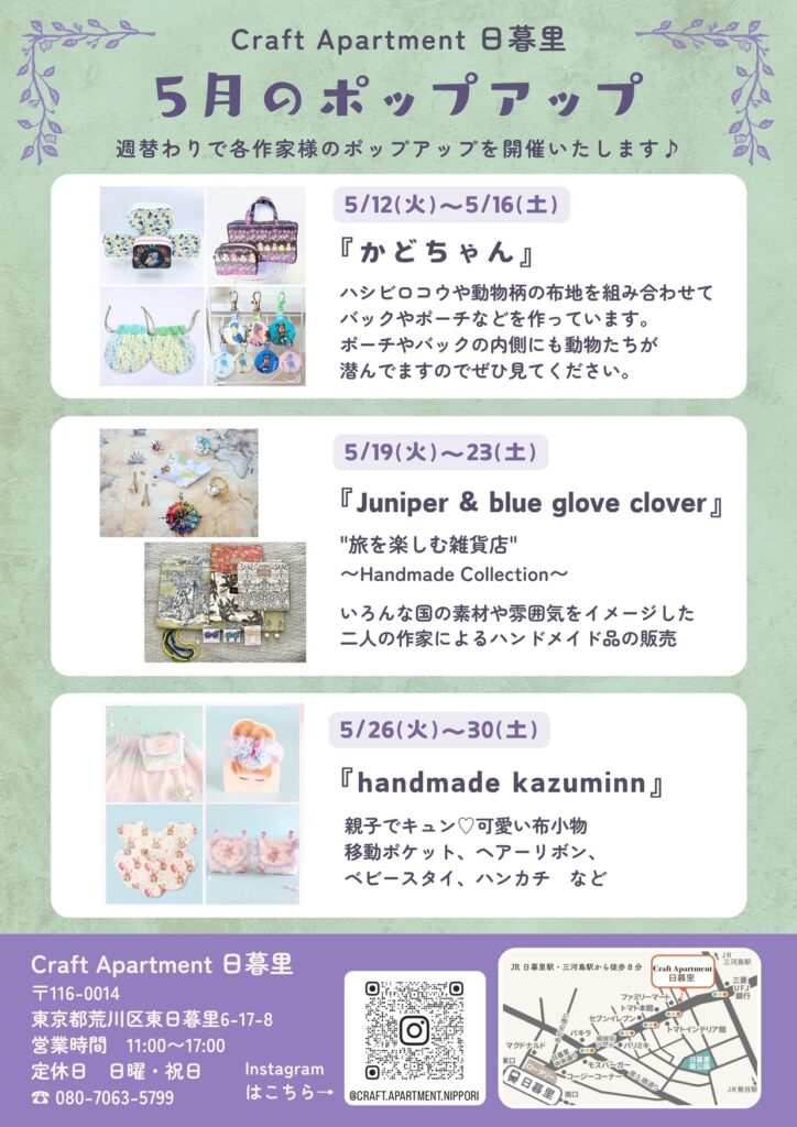 「クラアパ5月のPOPUPご案内」 入口を入ったテーブルにて週替わりで開催 普段のBOX内では扱えない作家さんの商品を販売します