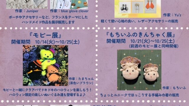 お知らせ 「クラアパ10月の作家さんのPOPUP」 入口のテーブルで週替わりに開催です ★9/ 30(火)~10/4(土)『フランス展』 ★10/ 7(火)~11(土) 『Yu’z』革アクセ ★10/14(火)~25(土) 『モピー展』★10/21(火)~25(土) モピー&もちいふ ★10/28(火)~11/1(土) 『花待夢&mon tresor』 2025年9月27日 turutome craft apartment日暮里 …