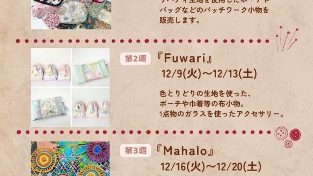お知らせ 「クラアパ12月の作家さんのPOPUP」 入口のテーブルで週替わりに開催です ★12/ 2(火)~12/6(土)『クリスマスショップ』 パッチワークの小物販売 ★12/ 9(火)~13(土) 『Fuwari』 布小物とアクセサリー ★12/16(火)~20(土)『Mahalo』 ニャンドゥティ刺繍アクセサリー 2025年11月20日 turutome craft apartment日暮里 …
